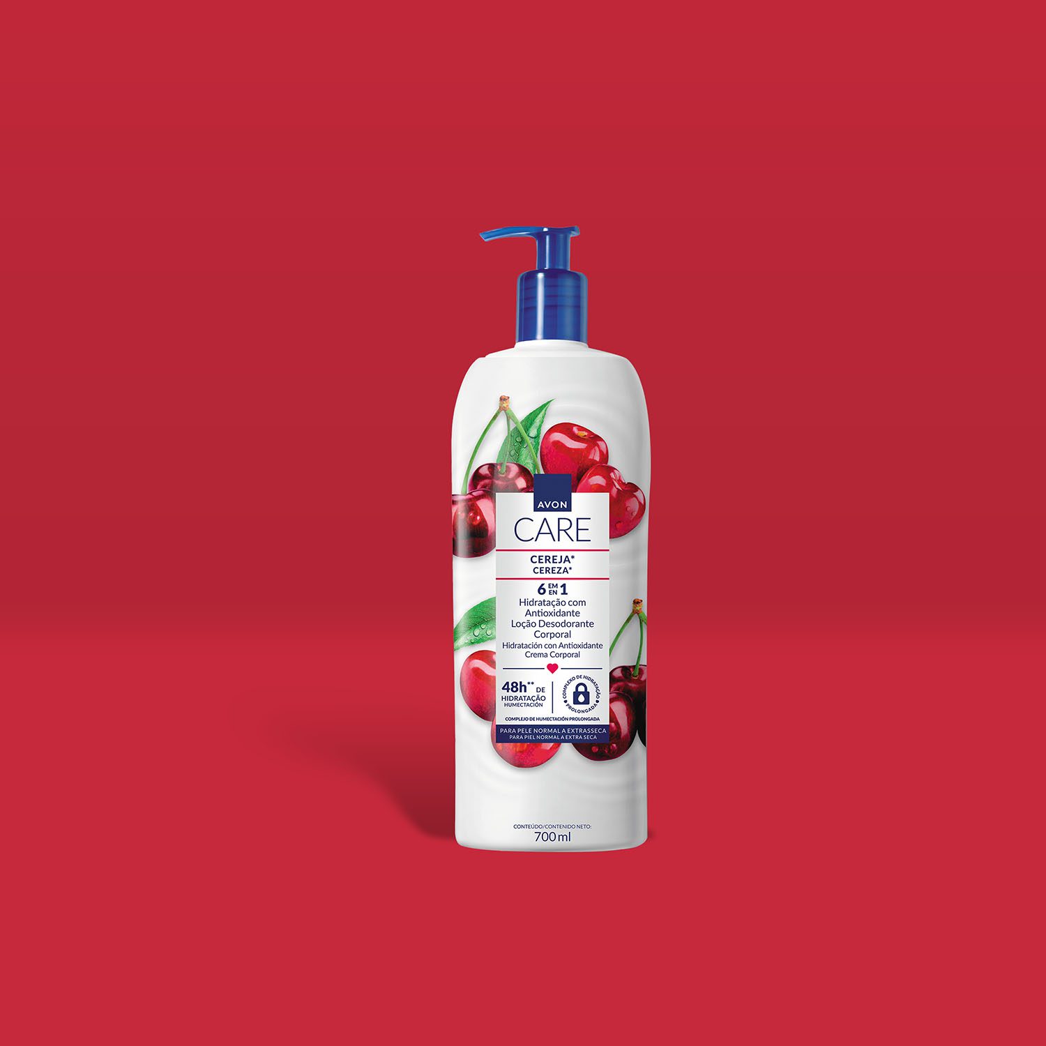 • A Loção Desodorante Corporal Cereja de Avon Care oferece 6 benefícios em um único produto, garantindo até 48 horas* de hidratação.