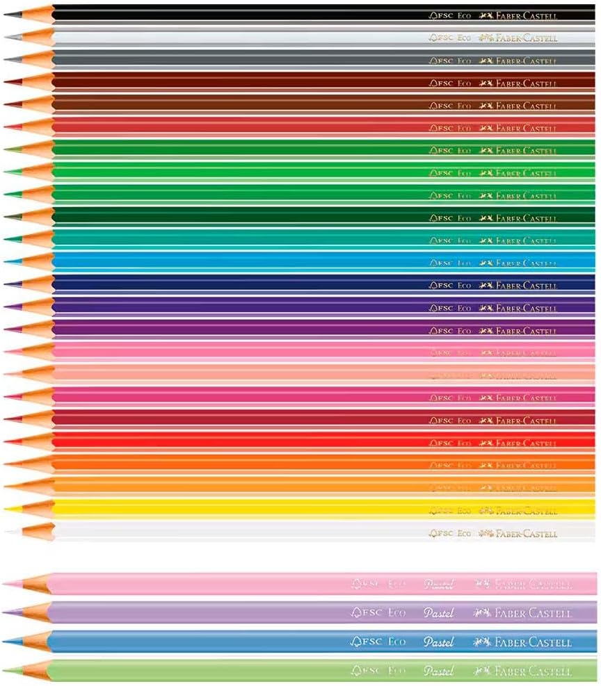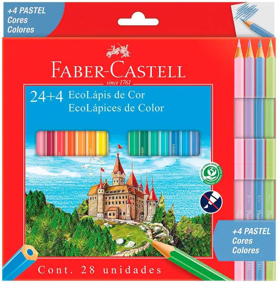 Deixe a criatividade fluir com os Ecolápis de Cor 24 Cores + 4 Tons Pastel da Faber-Castell. Seus desenhos mais vivos e criativos com ótima cobertura. O formato do Ecolápis é sextavado e sua formulação exclusiva garante a durabilidade do produto. Produzido com madeira 100% reflorestada e certificada pelo FSC: respeito ao meio ambiente. ATENÇÃO! Não recomendável para crianças de até 3 (três) anos, por conter parte(s) pequena(s) que pode(m) ser engolida(s) ou aspirada(s). Produto atóxico e validade indeterminada.