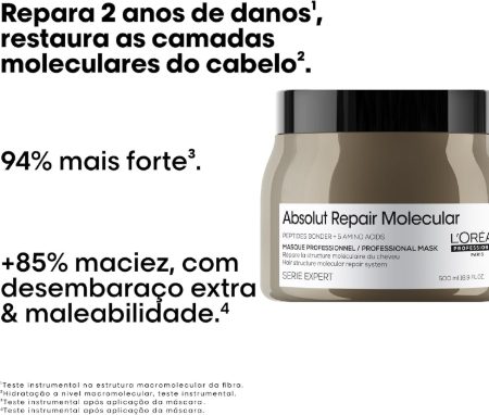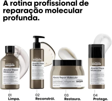 Para melhores resultados, use após Absolut Repair Molecular Shampoo e Sérum Reconstrutor com Enxágue. Aplique uniformemente no cabelo úmido. Deixar agir durante 1 a 2 minutos. Enxágue bem.