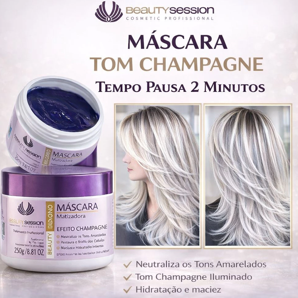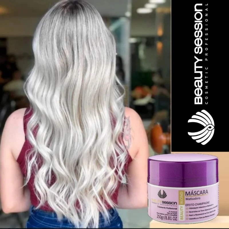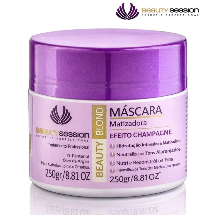 A MÁSCARA BEAUTY BLOND EFEITO CHAMPAGNE 250GR DA BEAUTY SESSION COSMETIC PROFESSIONAL É UMA MÁSCARA HIDRATANTE E MATIZANTE QUE NEUTRALIZA O TOM ALARANJADO E AMARELADO DOS CABELOS LOIROS DEIXANDO AS MECHAS CHAMPANHE. COM ÓLEO DE ARGAN E D PANTENOL, ALÉM DO ALTO PODER DESAMARELADOR, POIS PODE FICAR MAIS TEMPO NOS CABELOS. É UMA MÁSCARA MATIZANTE QUE HIDRATA E NÃO RESSECA, IDEAL PARA QUEM NÃO GOSTA DO CABELO MUITO CINZA.