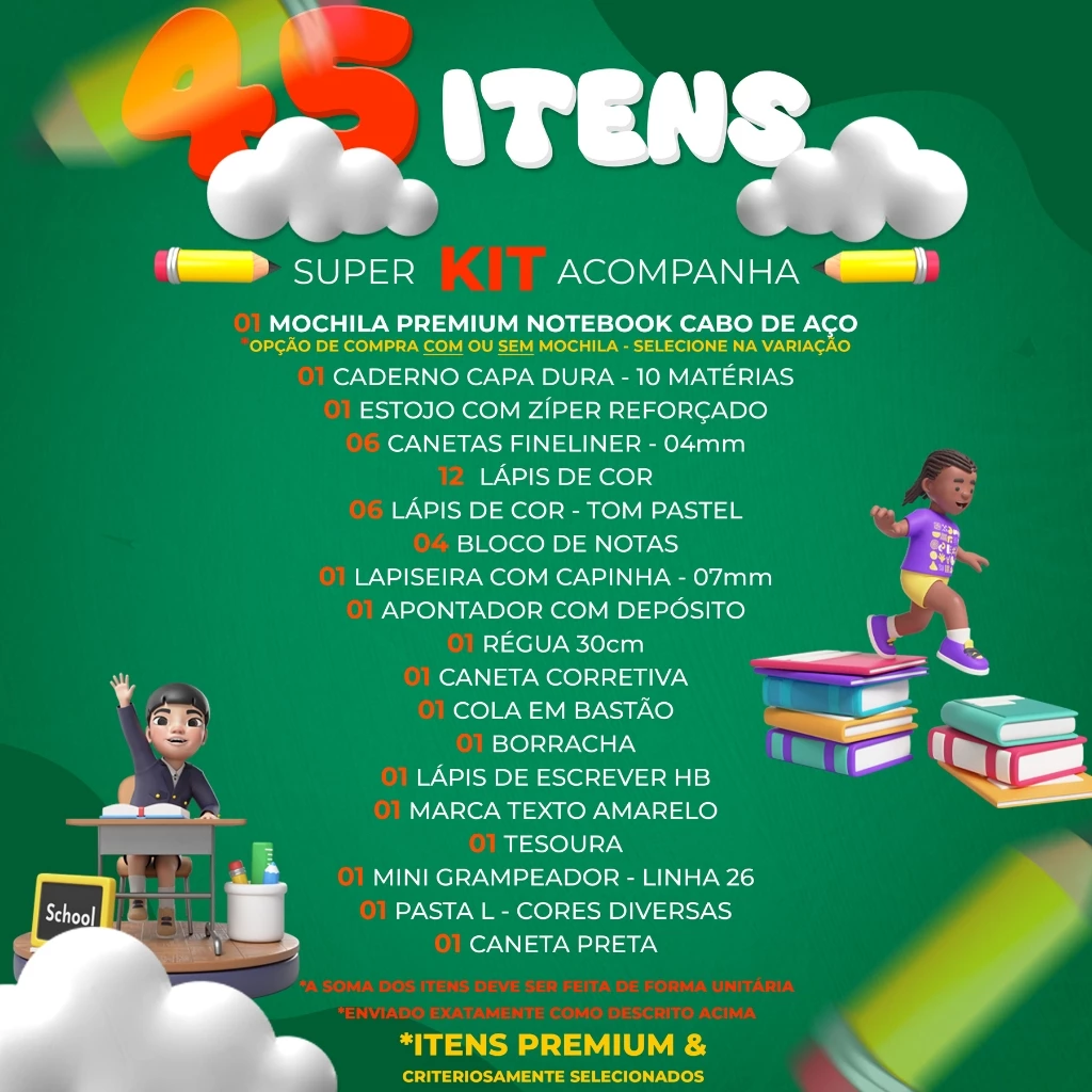 #TEMOS OPÇÃO DE COMPRA *SEM MOCHILA*, SOMENTE MATERIAL – SELECIONE NA VARIAÇÃO