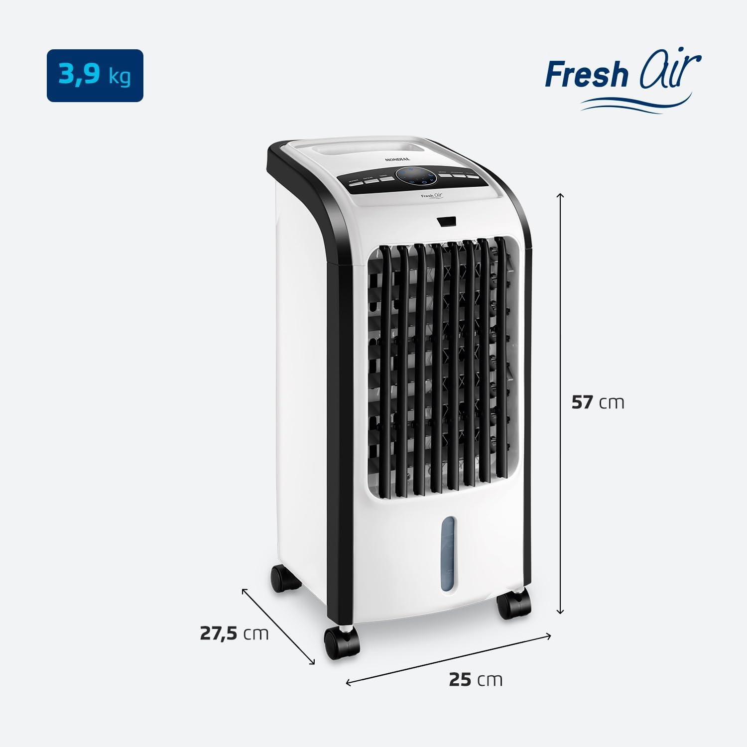 O Climatizador Mondial Fresh Air proporciona ar fresco e um ambiente confortável para sua família. Com 4 funções, o climatizador resfria, umidifica, filtra e ventila. Conta com 3 velocidades de ventilação, além das funções resfriar e oscilar. Possui função Timer que possibilita programar o tempo de funcionamento e oscilação das aletas, que assegura uma distribuição uniforme de ar na casa. Saiba mais sobre o CL-03 da Mondial: