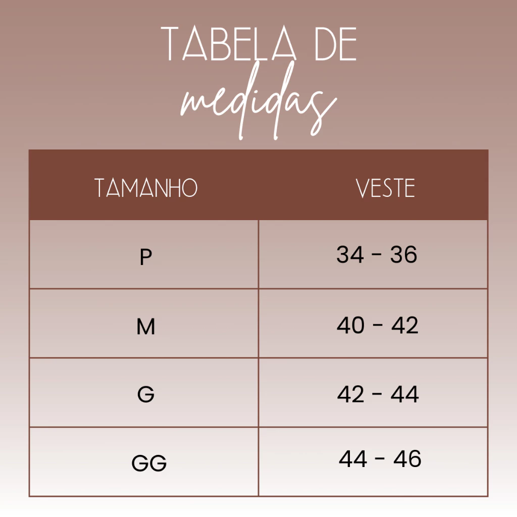 GG – Blusa: (Comprimento: 60cm / Largura: 54cm) Short: Comprimento: 38cm / Largura: 58cm)