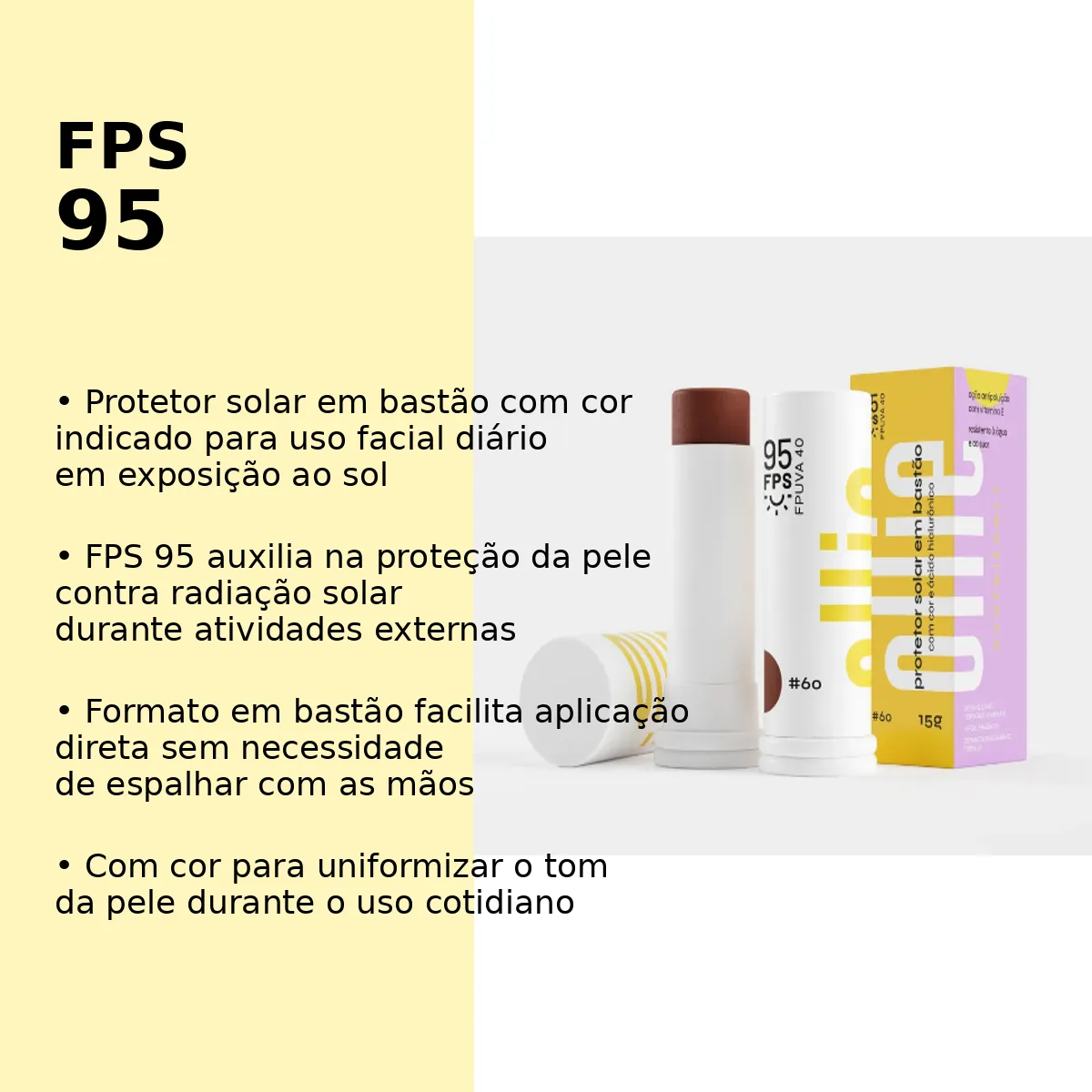 O protetor solar em bastão com cor FPS 95 tom 60 é indicado para proteção facial durante exposição ao sol. Seu formato sólido permite aplicação direta na pele, facilitando o uso diário em diferentes ambientes. A presença de cor auxilia na uniformização do tom da pele durante a aplicação. Pode ser utilizado em rotinas diárias, atividades externas e deslocamentos urbanos. Recomenda-se aplicar antes da exposição solar e reaplicar ao longo do dia conforme necessidade. Evite contato com olhos e utilize apenas na pele íntegra. Conteúdo da embalagem: um protetor solar em bastão com cor FPS 95 tom 60 Ollie.