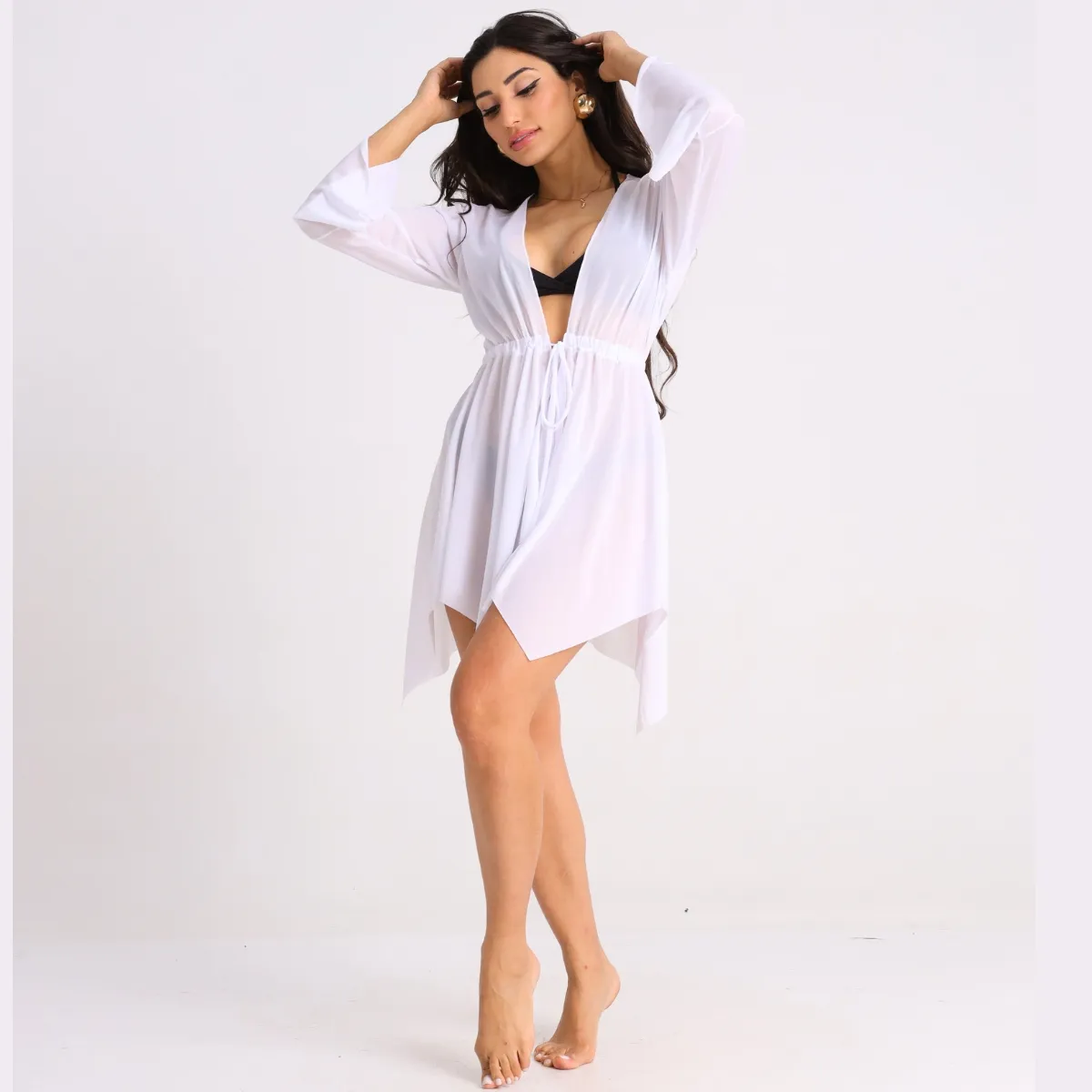 Aposte na elegância e leveza com nossa saída de praia em formato de kimono, confeccionada em tule transparente.