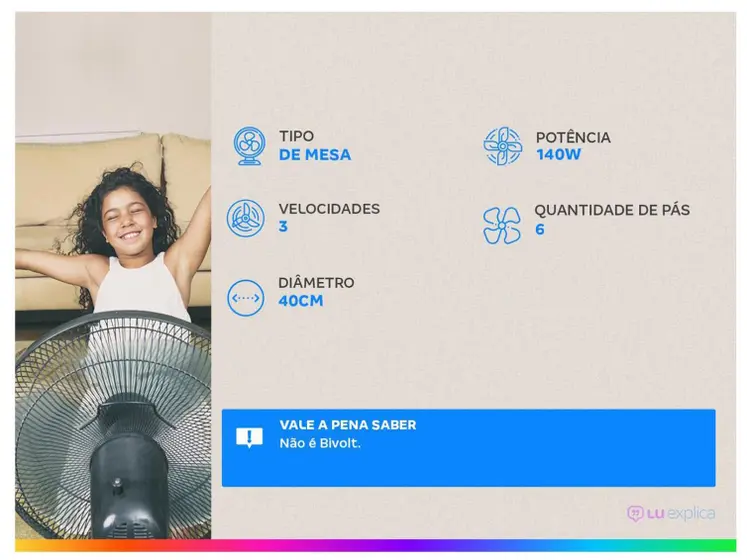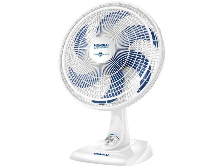 O Ventilador de Mesa Mondial Super Power VSP-40-W, nas cores branco e azul, é uma opção pra deixar o ambiente mais fresco e arejado. Ele tem 6 pás e 40cm de diâmetro. Com uma potência de 140W, a hélice tem um design aerodinâmico que busca uma maior vazão do ar, o que proporciona um vento forte. Ele é feito para ser silencioso, o que contribui para o bem-estar da família, permitindo conversar tranquilamente e assistir TV. O aparelho tem 3 velocidades (máxima turbo, média conforto, mínima silencioso) que permitem adequar o nível de ventilação à sua necessidade. O sistema oscilante ajuda a distribuir o ar pelo ambiente. A inclinação vertical é regulável, o que permite direcionar o fluxo do ar.